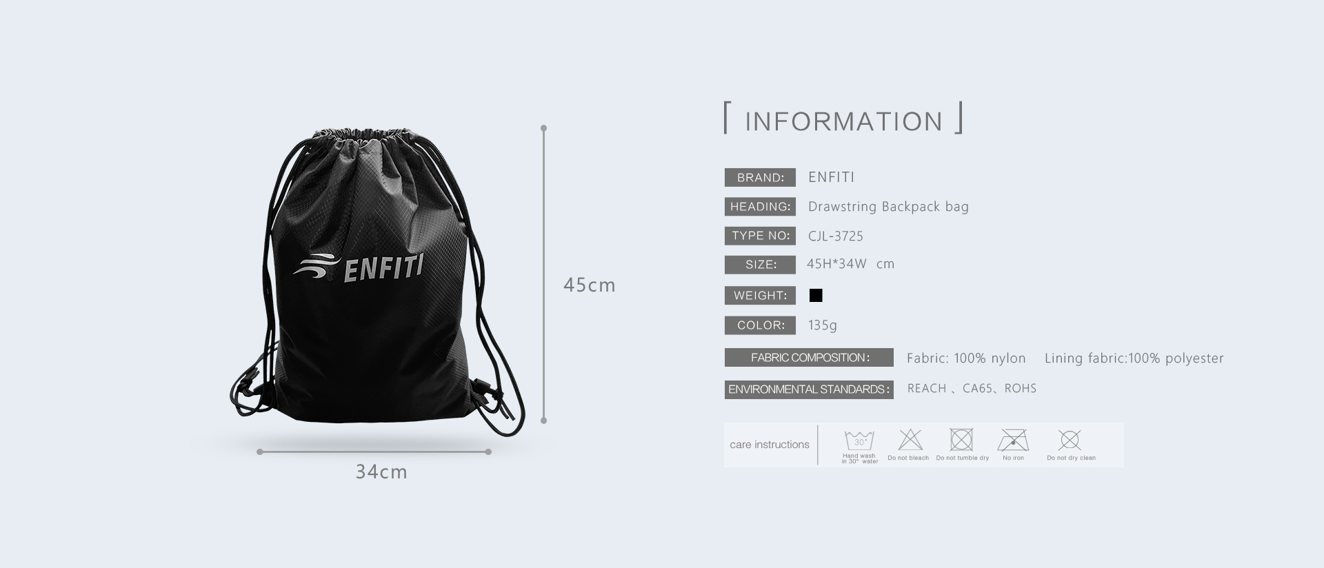 Weight: 135gFabric Composition: fabric: 100% nylon lining fabric:100% polyesterEnvironmental Standards:REACH ,CA65,ROHS